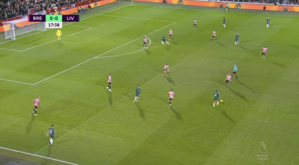 Note how Norgaard staying behind Tsimikas and Mee moving ahead of Konate, along with Janelt (Brentford’s No. 27) fending off Thiago (Liverpool’s No. 6) creates a space where, if an accurate cross comes in, Fabinho is left alone against potentially three opponents.