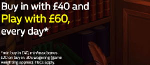 It is a well-known fact that all gamers like to get some additional cash when playing their favourite games in a casino. Well, the good people of William Hill decided to treat their loyal customers by boosting their buy-in by 50%. There is no catch, so you don’t need to worry, simply buy in with £40 from your balance, and William Hill will throw additional £20 right back at you!