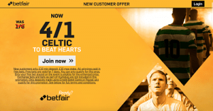 Make sure to also enter promo code ZFBDBB and place a maximum £10 bet on 4/1 Celtic to beat Hearts. In doing so you will qualify to be paid in free bets at the enhanced price if the Bhoys emerge victorious.