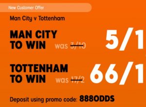 888sport has got Manchester City at 5/1 betting odds in a special welcome offer while Tottenham are available at a whopping 66/1 price for all new customers.