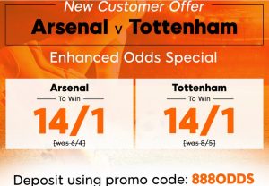 All punters who open their account with 888 using this link and the promo code 888ODDS can hope to grab an enhanced odds special of 14/1 on either Arsenal or Tottenham to win.