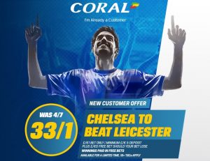 The Blues were available at 4/7 (1.57) but can now be backed at 33/1 (34.0) with an enhanced new customer offer at Coral.