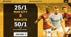 New Customers can get Man City at an enhanced 25/1 to beat Man Utd or Man Utd 50/1 to beat Man City. Max Stake £1. Winnings paid in free bets, valid for 7 days, only deposits with cards/Paypal count. Exchange and multiple bets excluded. T&C’s Apply. 18+|Gamble Aware.
