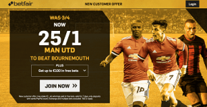 New Customers can get Man Utd at an enhanced 25/1 to beat Bournemouth. Max Stake £1. Winnings paid in free bets, valid for 7 days, only deposits with cards/Paypal count. Exchange and multiple bets excluded. T&C’s Apply. 18+|Gamble Aware.