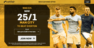 New Customers can get Man City at an enhanced 25/1 to beat Everton. Max Stake £1. Winnings paid in free bets, valid for 7 days, only deposits with cards/Paypal count. Exchange and multiple bets excluded. T&C’s Apply. 18+|Gamble Aware.