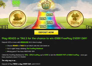888Casino offers up to €888 FreePlay every single day. This amazing prize is available through the popular Heads or Tails game. Just use the promo code and start flipping coins in order to follow the leprechaun and climb the FreePlay Rainbow. Every correct guess will get you on higher levels that hide 10% – 40% FreePlay up to €200. If you are lucky enough to reach the end of the Rainbow you will win the maximum prize of €888 FreePlay!