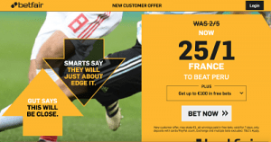 New Customers can get France at an enhanced 25/1 to beat Peru. Max Stake £1. Winnings paid in free bets, valid for 7 days, only deposits with cards/Paypal count. Exchange and multiple bets excluded. T&C’s Apply. 18+|Gamble Aware.