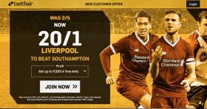 Jurgen Klopp’s charges have a chance to further close the gap behind the leading pack when they take on out-of-sorts Southampton, and their fans will be glad to hear that Betfair has enhanced the price on home win to 20/1.
