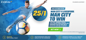 Liverpool, on the other hand, are also in excellent spirits after the 4-0 hammering of Arsenal, but Coral has decided to enhance the odds on home win to whopping 25/1 for all first time depositors.