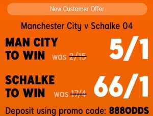 At the same time, those hoping for a miracle can also back Schalke at 66/1 to win at the Etihad.