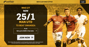 New Customers can get Man Utd at an enhanced 25/1 to beat Swansea. Max Stake £1. Winnings paid in free bets. Full T&Cs Apply. 18+|Gamble Aware.