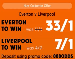888 sport has prepared a special new customer offer for the Merseyside derby with Liverpool available at 7/1 betting odds and Everton found at 33/1. This enhanced price is available for new players only.