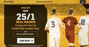 New Customers can get Real Madrid at an enhanced 25/1 to qualify for the final. Max Stake £1. Winnings paid in free bets, valid for 7 days, only deposits with cards/Paypal count. Exchange and multiple bets excluded. T&C’s Apply. 18+|Gamble Aware.