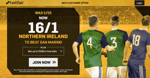 Michael O’Neill’s side now take on minnows San Marino, who conceded 30 goals in 6 qualifying defeats, but the good news is that new Betfair customers who register through this link are quoted a special 16/1 price on away win.