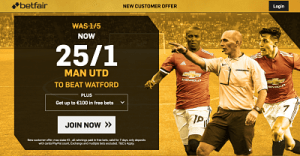 New Customers can get Man Utd at an enhanced 25/1 to beat Watford. Max Stake £1. Winnings paid in free bets, valid for 7 days, only deposits with cards/Paypal count. Exchange and multiple bets excluded. T&C’s Apply. 18+|Gamble Aware.