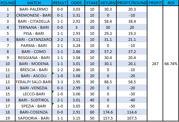 With 287 units in profit having a standard stake of 10 is excellent. Add another 0 to the stake of 10 and the profit would have turned in 2870. As I previously explained, the d’Alembert betting system is less risky considering the small increase after each loss. Also, Bari’s longest streak without a draw was just 4 games, the stakes could be easily covered by the previous wins. How else you could get a 66.74% ROI (return on investment) after 19 bets?