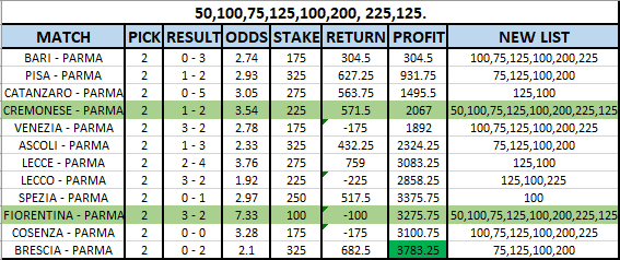 With a predefined goal of earning 1000 units, we set up the Labouchere list at the top of the table. Parma exceeded all of our expectations this term winning 8 out of their 12 matches played away.