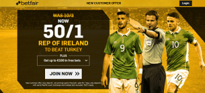 New Customers can get Ireland at an enhanced 50/1 to beat Turkey. Max Stake £1. Winnings paid in free bets. Full T&Cs Apply. 18+|Gamble Aware.