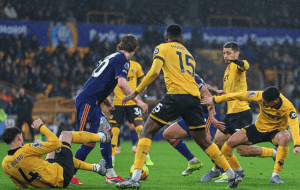 Wolves, meanwhile, had several bright moments on the counter-attack. Breakout star Mateus Mane saw an acrobatic attempt held by Nick Pope, while Hugo Bueno’s powerful drive from the right side of the area brushed the roof of the net.